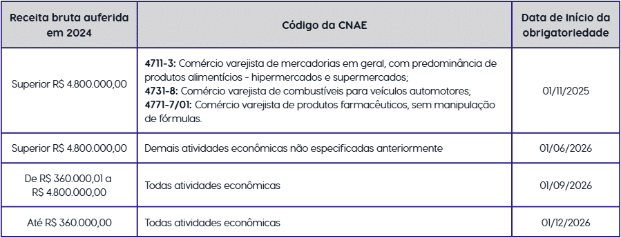 Em 30 de janeiro de 2026, a Receita Estadual de Goiás prorrogou, por meio da Instrução Normativa nº 1.623/2026-GSE, o prazo para cumprimento dessa obrigatoriedade.  A implementação da norma será escalonada, conforme a faixa de faturamento bruto em 2024 e a atividade econômica (CNAE principal) do contribuinte.